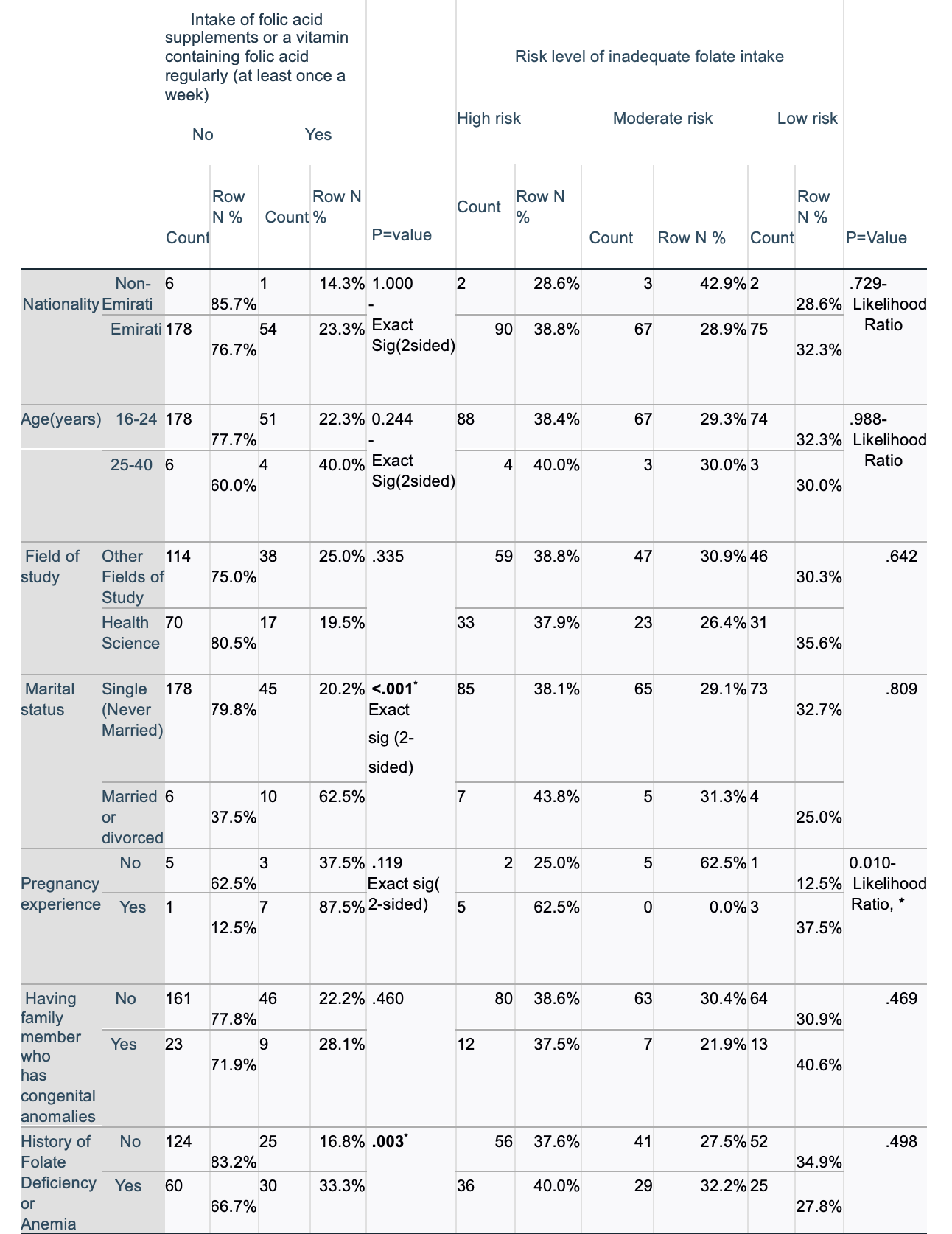 Taking FA supplements or vitamins containing FA was statistically highly associated with being married or divorced (p < 0.001) and having a history of folate deficiency or anaemia (p = 0.003), as shown in Table 3. In contrast, no significant difference in terms of FA supplementation was observed among individuals with different nationalities (p = 0.729), age groups (p = 0.244), fields of study (p = 0.335), pregnancy experiences (p = 0.119), and having a family member with a congenital disorder or not (p = 0.460). Similarly, none of the factors, except having pregnancy experience (p = 0.010), were significantly associated with the risk level of inadequate folate intake.