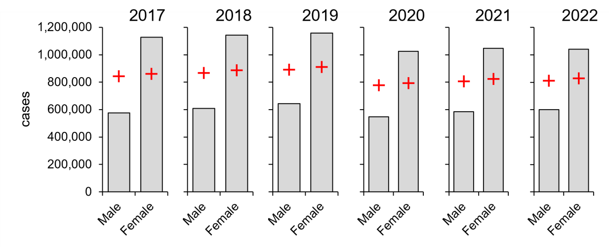 Figure 3: Females carry a larger burden of diagnosed chlamydia (2017–2022).