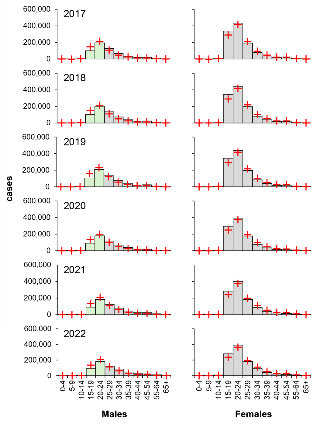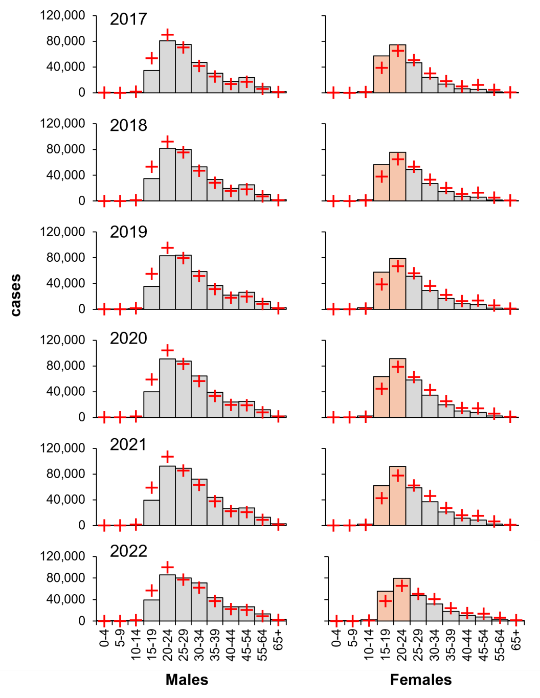 Figure 4: Young females carry a larger proportional burden of diagnosed gonorrhoea (2017–2022).
